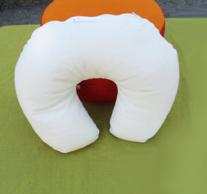 Ce coussin tour de nuque est garni de balle de petit épeautre biologique et de fleurs de lavande fine biologique, une matière aérée, qui respire.